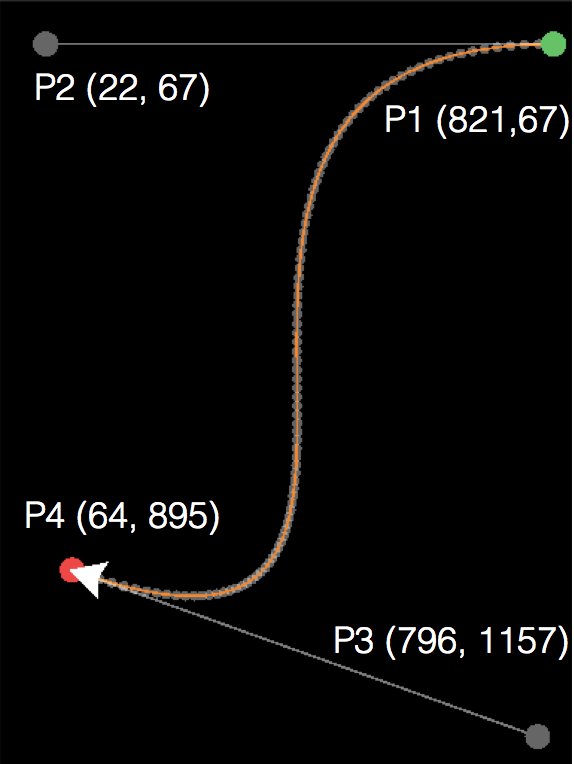 在本模板中,我們只將貝茲曲線用來描繪路徑。如下圖,貝茲曲線是由 4 個參考點產生的,你可以透過運行 CurveDrawing (https://gitlab.com/keviner2004/CurveDrawing) 專案取得這四個參考點,並套用在 move.getCurve 上。