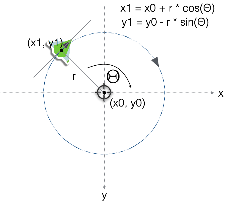 有時候我們只是很單純的希望一個物體環繞另一個物體,最簡單的方式就是使用如下圖的三角函數,在每禎隨著被繞物體的移動而更新位置。